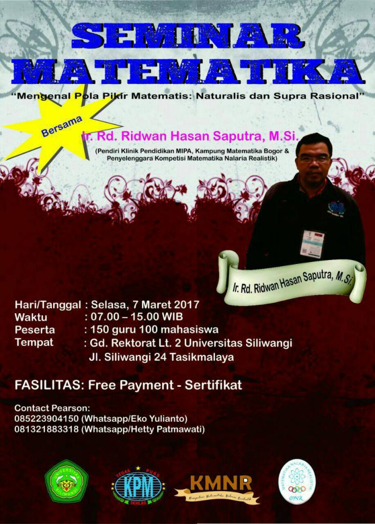 Dalam rangka mengembangkan pendidikan matematis berbasis program unggulan, jurusan matematika FKIP Unsil akan mengundang Ir.Rd. Ridwan Hasan Saputra, M.Si. (Pendidikan Klinik Pendidikan MIPA/Kampung Matematika Bogor-Kompetisi Matematika Nalaria Realistik) dalam acara seminar matematika dengan tema Mengenal Pola Pikir Matematis: Naturalis dan Supra Rasional yang akan dilaksanakan pada: Hari/tanggal : Waktu : Peserta : Tempat : Fasilitas: […]