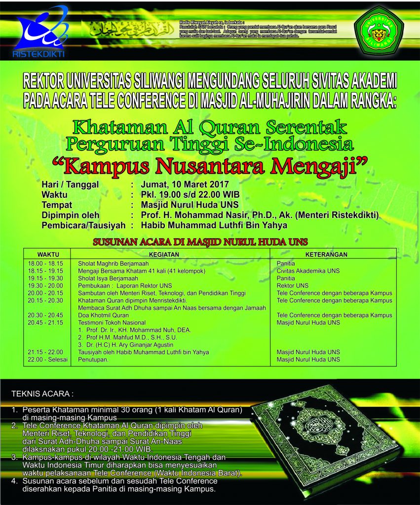 Rektor Universitas Siliwangi Mengundang Seluruh Sivitas Akademi Pada Acara Teleconference Di Masjid Al-Muhajirin Dalam Rangka: Khataman Al Quran Serentak Perguruan Tinggi Se-Indonesia “Kampus Nusantara Mengaji”